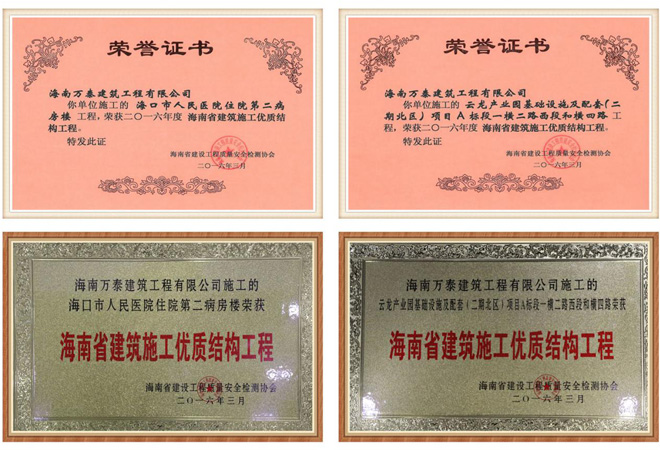 2016年3月,由国产精品人人妻人人爽9区-亚洲熟女乱色综合一区-亚洲日韩av无码一区二区三区-狼人无码精华av午夜精品-一本大道伊人AV久久综合承建的“海口市人民医院住院第二病房楼”及“云龙产业园基础设施及配套(二期)项目”工程被海南省建设工程质量安全检测协会评为《海南省建筑施工优质结构工程》荣誉称号。